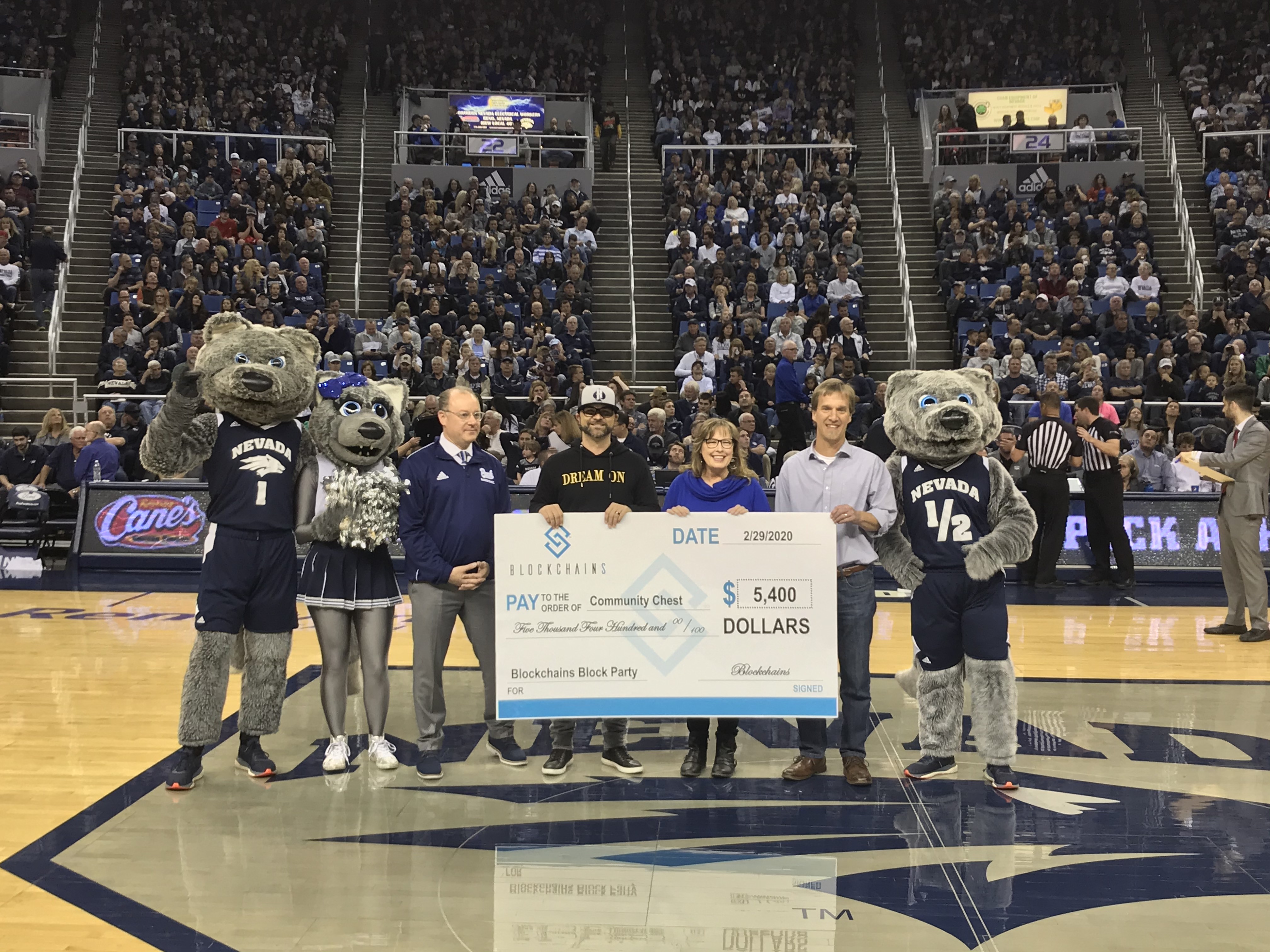 Before a nearly sold-out and enthusiastic crowd, Blockchains concluded its second season-long run of donating $50 for every blocked shot over the course of the Nevada Men’s Basketball Team’s 2019-2020 season. With another talented and athletic team, the total amount donated by Blockchains to Community Chest for all of its programs came to $5,400.