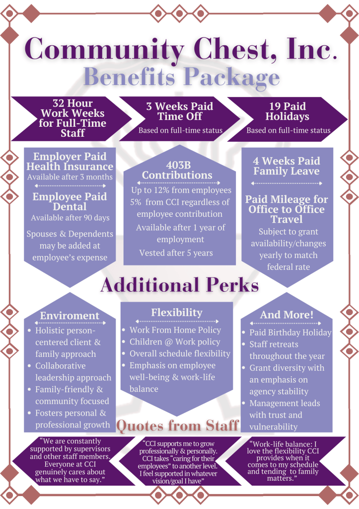 What began as an idea — to create an organization that would be a catalyst for change and a center for resources to help people help themselves — has evolved into a broad team of people and volunteers, who together, build healthy families and communities.